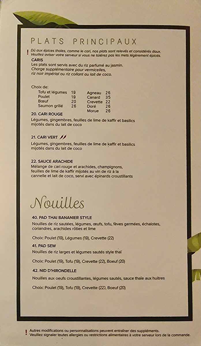 Bananier invites you to embark on a delightful journey through the rich and exotic flavors of Thailand. The menu boasts a tantalizing array of dishes sure to satisfy every palate. Among the must-try offerings, the Pad Thai Bananier Style stands out, expertly prepared to juxtapose the savory and slightly sweet notes that make this dish a crowd favorite. For a hearty experience, indulge in the Guay Tiaw or the ever-popular Pad Sew Ew, both brimming with rich flavors and traditional Thai ingredients. Each plate is crafted with care, showcasing a commitment to authenticity that transports you straight to the bustling streets of Thailand.